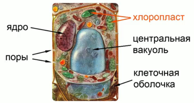 Клетка окружена снаружи тонкой пленочкой – это клеточная мембрана, снаружи от клеточной мембраны лежит клеточная оболочка, которая намного толще клеточной мембраны. Она состоит из особого вещества – целлюлозы, с которой мы сталкиваемся каждый день, ведь из нее состоит бумага и вата. Целлюлоза хоть и толще клеточной мембраны, но гораздо лучше пропускает различные вещества, такие как вода и растворенные в ней соли. Между двумя клетками, которые прижаты друг к другу, происходит взаимодействие с помощью химических веществ. Толстая клеточная оболочка может помешать этому взаимодействию, поэтому кое-где в клеточной оболочке есть небольшие окошки, которые называются порами. Поры двух соседних клеток находятся точно напротив друг друга. Внутренние части клетки называются органоиды. Внутри клетки находится большое количество органоидов, которые весьма разнообразны, мы рассмотрим лишь те, которые очень важны и являются отличительными для растительной клетки.