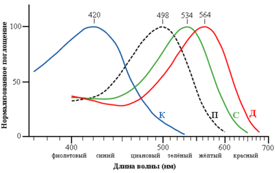 Средние нормализованные спектральные характеристики чувствительности цветовых рецепторов человека — колбочек. Штриховой линией показана чувствительность палочек — рецепторов сумеречного зрения. Ось длин волн на графике имеет логарифмический масштаб