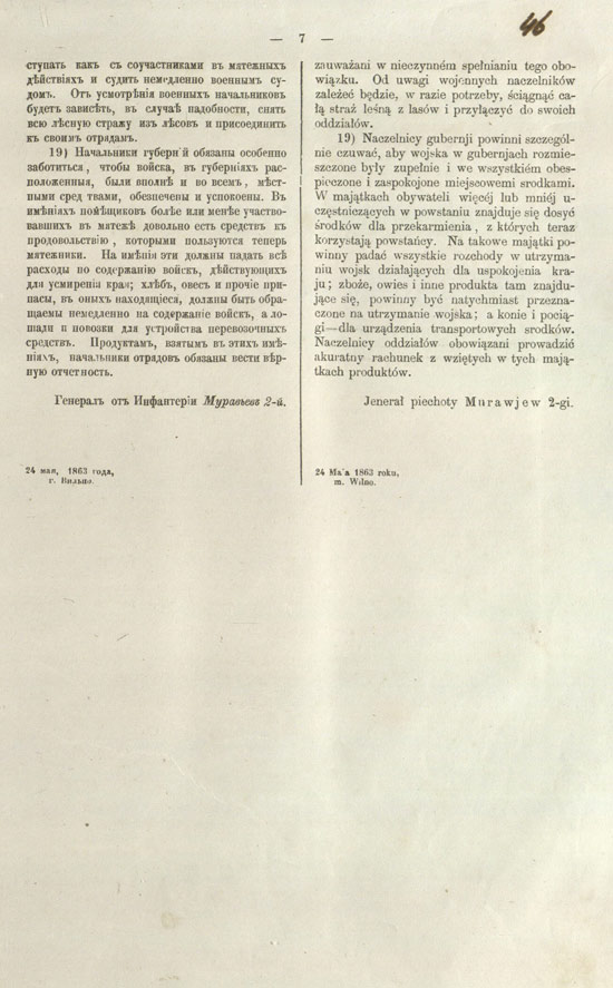 2) 24-го числа издана была инструкція, в которой опредѣлялись власть и круг дѣйствій военных и гражданских начальников, поставленных в уѣздах, и излагались правила преслѣдованiя мятежных покушеній, с соучастiем самих обывателей; главное состояло в том, что каждый отвечал за свой участок, и виновные обыватели облагались денежными штрафами, независимо от законной ответственности.