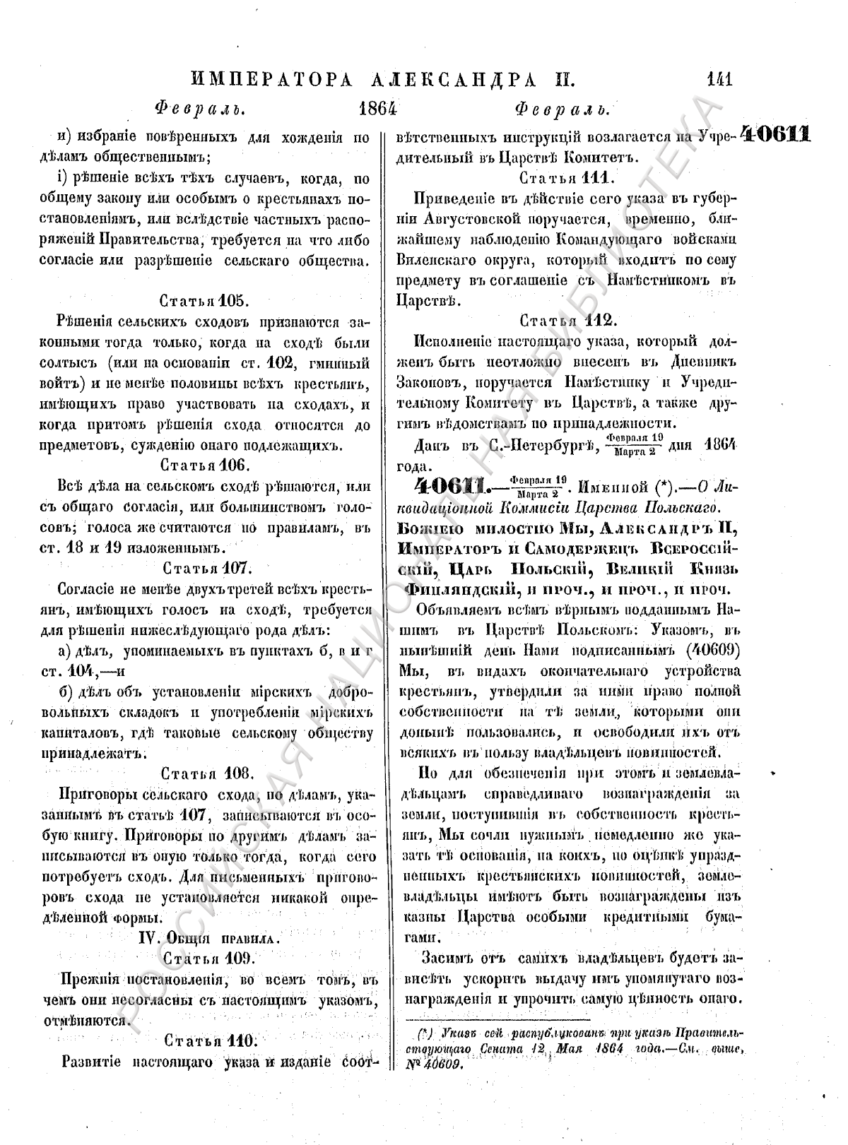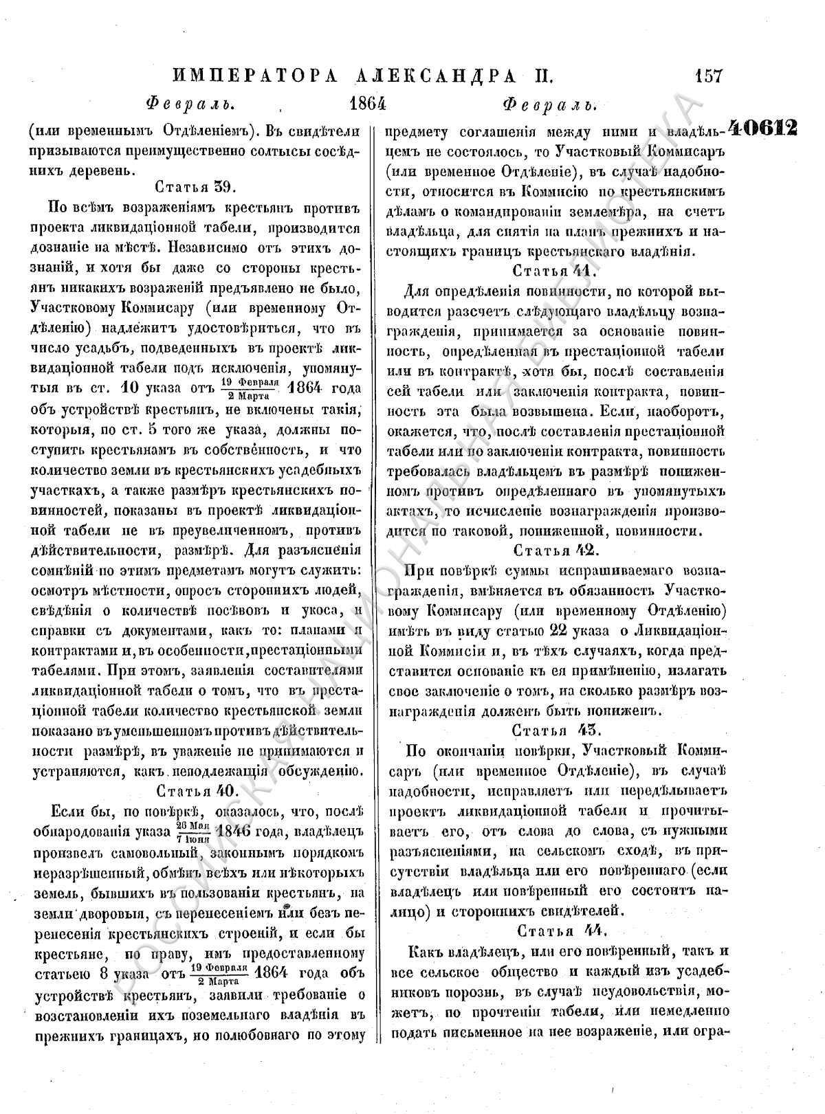 4) На устройство вообще мировых учрежденій, а также на дѣйствія повѣрочных коммиссій как в отношеніи обозпеченія быта крестьянскаго сословія дарованными ему правительствомъ правами, так равно и землевладельцев—следующую им по закону собственностію.