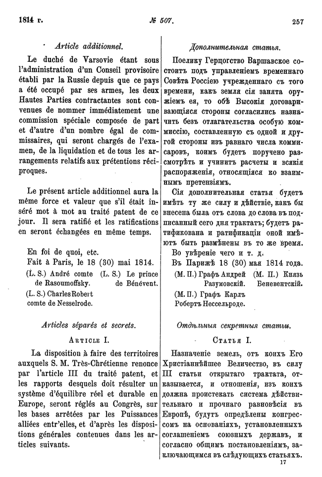 В этой ситуации 16 сентября 1814 г. между Россией и Пруссией было подписано секретное соглашение, по которому с территории Саксонии выводились все русские войска, и управление этим германским королевством передавалось прусской военной администрации.