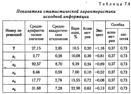 В нашем примере (табл. 7.4) самая высокая вариация по х5 (V = 22,98), но она не превышает 33 %. Значит, исходная информация является однородной и ее можно использовать для дальнейших расчетов.