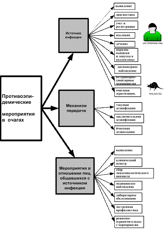 В эпидемическом очаге организуют и проводят следующие группы мероприятий по направленности действия (рис. 10).