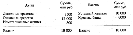 Следовательно, в активе добавляется еще одна статья "Нематериальные активы" на сумму 500 млн руб. и одновременно уменьшаются на эту же сумму денежные средства предприятия. Опять изменения произошли только в активе, так как обязательства в связи с этим хозяйственным актом не изменились. В итоге предприятие имеет основных средств на сумму 12 млрд руб., нематериальных активов 500 млн руб. и свободных денежных средств в банке на сумму 3500 млн руб., а по пассиву - 16 000 млн руб. обязательств.