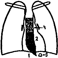 | Рис.64. Дивертикула пищевода в правой косой проекции. 1. Пульсионный дивертикул - ограниченное выпячивание округлой формы на слабом участке стенки. 2. Тракционный дивертикул- натяжение стенки треугольной формы спаечным процессом в средостении. |