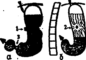| Рис.69. Схематическое изображение хронической язвы: а) "на контуре" в прямой проекции; б) "на рельефе" в правой косой проекции. 1. Уплощённое дно ниши при каллёзной язве. 2. Конвергенция складок к "нише" – признак рубцевания тканей вокруг язвы. 3. Перистальтическая волна. |
