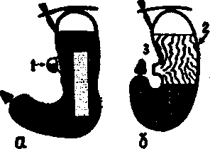 | Рис.70. Некоторые осложнения язвенной болезни желудка в прямой проекции: а) при пенетрации язвы желудка в соседний орган; б) деформация желудка при старой язве. 1. Пенетрирующая язва - глубокая "ниша", содержащая воздух и барий. 2. Неравномерное утолщение и извилистый ход складок – признаки гастрита, сопровождающего язвенную болезнь. 3. Улиткообразная деформация- луковица и антральный отдел подтянуты к телу желудка вследствие укорочения малой кривизны при рубцевании язвы. |