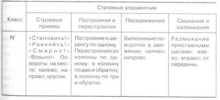 Для примера приведем фрагмент таблицы основных понятий, которыми должны овладеть учащиеся IV класса по разделу строевых упражнений.