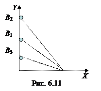 2. Меняется цена товара Y, а цена товара Х остается неизменной. Рассуждения аналогичны рассуждениям в случае 1, с той лишь разницей, что теперь меняется угол наклона бюджетной линии к оси Y (рис. 6.11).