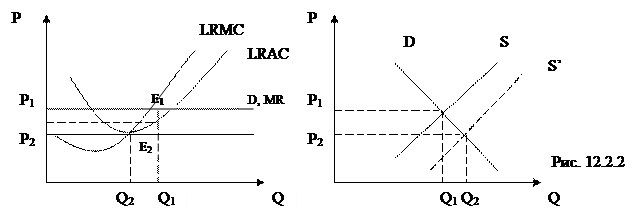 Фирмы начнут выходить из отрасли, следовательно, на рынке уменьшается предложение товара, а кривая предложения смещается влево. Фирмы будут продолжать выходить из отрасли до тех пор, пока цена на рынке не поднимется до уровня минимума LRAC, а оставшиеся фирмы в отрасли не начнут получать нулевую экономическую прибыль (рис. 12.2.3.).