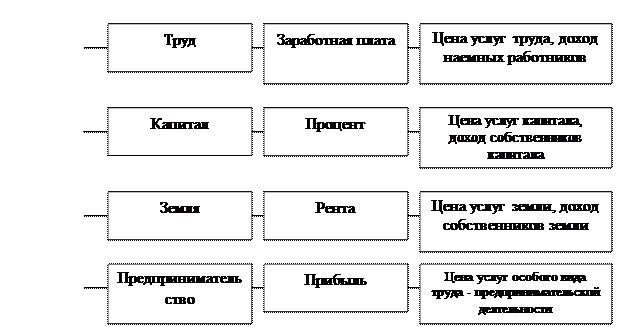 Различают сами факторы производства (трудовые, капитальные, природные ресурсы и предпринимательство) и услуги, оказываемые этими факторами. Каждый фактор производства, выступая как элемент производственного процесса, оказывает определенные услуги. Величина цены этих услуг обуславливает доходы собственников факторов производства (рис.15.1):