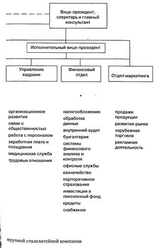 Самые известные механистические бюрократии – это фирмы, занятые массовым производством. Их операционные рабочие потоки представляют собой своего рода разомкнутые цепочки, через один из концов которых в систему поступает сырье. В дальнейшем система функционирует герметично, обрабатывая исходные материалы с помощью последовательных стандартизированных операций, в результате чего на другом ее «полюсе» появляется конечная продукция. Эти горизонтальные операционные цепочки обычно сегментированы на звенья, каждое из которых образует один функциональный участок с отчетностью по вертикальной цепи полномочий. Даже в огромных фирмах массового производства эффект масштаба таков, что эти функциональные структуры сохраняются до самого верха иерархии. Аналогично в обрабатывающих отраслях, когда фирма не в состоянии автоматизировать операции, но должна использовать большое число работников, она тяготеет к функциональной структуре механистической бюрократии.[49] На рис. 9.2 представлена органиграмма функциональной сверху донизу крупной сталелитейной компании.