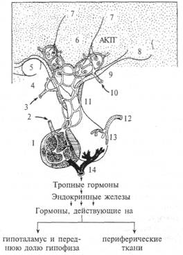 1 — передняя доля гипофиза; 2 — артерия передней доли гипофиза; 3 — гормональная обратная связь; 4 — артерия переднего гипоталамуса; 5 — зрительный перекрест; 6 — тиреотропный освобождающий гормон; 7 — аксон; 8 — мамиллярное тело; 9 — гипоталамическая артерия; 10 — гормональная обратная связь; II — воротная система; 12 — артерия задней доли гипофиза; 13 — задняя доля гипофиза; 14— венозный отток; АКТГ — адренокортикотропный гормон.
