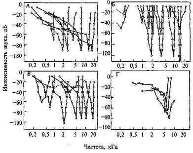 А — волокна слухового нерва; Б — нижнее двухолмие; В — трапециевидное тело; Г — медиальное коленчатое тело. За ноль шкалы принято звуковое давление 0,0002 дин/см2.