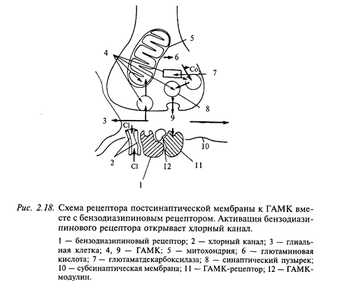 Из тормозных медиаторов ГАМК является самой распространенной в ЦНС. Она синтезируется из L-глутаминовой кислоты в одну стадию ферментом декарбоксилазой, наличие которой является лимитирующим фактором этого медиатора. Известно два типа ГАМК-рецепторов на постсинаптической мембране: ГАМКА (открывает каналы для ионов хлора) и ГАМКБ (открывает в зависимости от типа клетки каналы для. К+ или Са++). На рис. 2.18 показана схема ГАМК-рецептора. Интересно, что в его состав входит бензодиазипиновый рецептор, наличием которого объясняют действие так называемых малых (дневных) транквилизаторов (седуксена, тазепама и др.). Прекращение действия медиатора в ГАМК-синапсах происходит по принципу обратного всасывания (молекулы медиатора специальным механизмом поглощаются из синаптической щели в цитоплазму нейрона). Из антагонистов ГАМК хорошо известен бикукулин. Он хорошо проходит через гематоэнцефалический барьер, оказывает сильное воздействие на организм даже в малых дозах, вызывая конвульсии и смерть. ГАМК обнаруживается в ряде нейронов мозжечка (в клетках Пуркинье, клетках Гольджи, корзинчатых клетках), гиппокампа (в корзинчатых клетках), в обонятельной луковице и черной субстанции.