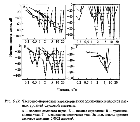 Частотно-пороговые характеристики нейронов слуховой системы. Как было описано выше, все уровни слуховой системы млекопитающих имеют тонотопический принцип организации. Другая важная характеристика нейронов слуховой системы - способность избирательно реагировать на определенную высоту звука.