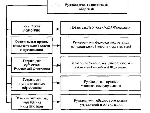 В Российской Федерации непосредственное управление ГО возложено на МЧС России. Принятые министерством в пределах своих полномочий решения обязательны для органов государственной власти, субъектов Российской Федерации, местного самоуправления, предприятий, учреждений и организаций независимо от принадлежности и форм собственности, а также должностных лиц и граждан. Начальники органов управления по ГОЧС являются первыми заместителями соответствующих начальников гражданской обороны (НГО), Органы управления ГО приведены на схеме 9.