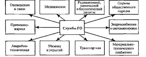 Вне зависимости от характера производственной деятельности на объекте по решению руководителя могут создаваться службы ГО: оповещения и связи, медицинская, радиационной, химической и биологической защиты, охраны общественного порядка, противопожарная, энергоснабжения и светомаскировки, аварийно-техническая, убежищ и укрытий, транспортная, материально-технического снабжения и другие (схема 11). На них возлагается выполнение специальных мероприятий и обеспечение действий формирований при проведении аварийно-спасательных и других неотложных работ.