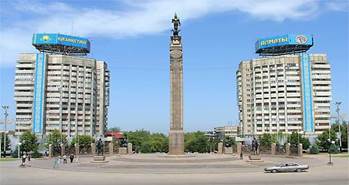 здание Акимата Алматы и ТЦ «Алмалы», а с другой стороны Площади
