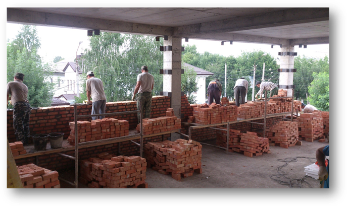 Большую часть времени на практики мы занимались кладочными работами (рис. 7). Иногда пособничали каменщикам, а иногда сами занимались кладкой. Процесс мы начинали с разбивки площади для кладки по кладочному плану этажа, затем следовала установка шнуров, и очистка поверхности пола от пыли и грязи. Следом начинается первый ряд кирпичей. Наружные стены были толщиной 380 мм, внутренние толщиной в 250 и 120 мм. Следует отметить, что вести кладку более толстых стен заметно легче, так как в этом случае не все кирпичи требуют проверки по отвесу и шнурам. Каждый угловой кирпич мы поверяли с помощью отвесов. Процесс шел с перевязкой вертикальных швов, и мы старались не допускать неправильной связки. Каждые несколько рядов кирпичей, мы прикладывали кладочную сетку и сваривали с закладной деталью. Закладные детали из металлических уголков и пластин были установлены по всей высоте кладочного пространства (рис. ).