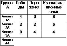 | Группа А | Побе- ды | Пора- жения | Классифика- ционные очки | Разница игровых очков |