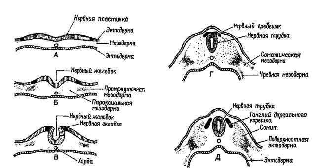 Рис, IX-5, Схема формирования нервной трубки, из которой в дальнейшем развивается спинной и головной мозг (Truex, Carpenter, 1969).