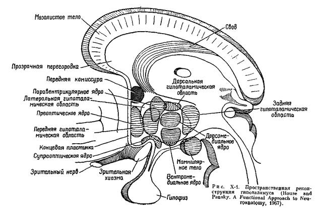 Так, наблюдались изменения температуры тела, осмотического давления тканевой жидкости, функции гипофиза и других эндокринных желез, а также изменения уровня сахара в крови. Когда постепенно была изучена организация этих нейронных систем, стало очевидным, что группы клеток в стволе мозга действуют как рецепторные зоны в отношении субстанций или переменных, которые они контролируют. Так было обнаружено, что инъекции гипертонического раствора соли в третий желудочек вызывает у козы обильное поглощение воды (Andersson, 1953). Тепло, приложенное к основанию переднего края третьего желудочка, сразу же ведет к изменению в механизмах терморегуляции всего тела млекопитающего (Ranson, Fisher and Ingram, 1937); инъекции андрогенов и эстрогенов, меченных радиоактивными молекулами, непосредственно позади этой области сопровождаются различным их поглощением клетками мозга, стимуляция которых вызывает половое поведение (Michael, 1962; Davidson, Jones and Levine, 1968; см. также рис. 1Х-4); сходным образом меченые молекулы глюкозы максимально усваиваются труппой клеток, расположенных еще дальше назад и контролирующих процесс поглощения пищи (см. гл. X; Mayer, 1963), а локальные изменения в парциальном давлении СОг в задней части ствола мозга вызывают резкие изменения частоты и глубины дыхания (Meyer, 1957). Все эти виды чувствительности локализованы в структурах, которые расположены в стволе мозга, довольно близко к желудочкам средней линии (третьему ж четвертому).