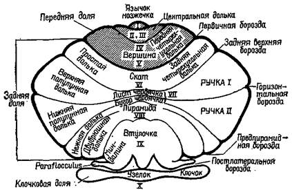 Рис. ХН-10. Схематическое изображение борозд и долек мозжечка (Lar-sell, 1951; Jansen, Brodal, 1958; Angevine et al., 1961). Части мозжечка, расположенные сзади по отношению к постлатеральной борозде, составляют клочок (archicerebellum), а части мозжечка, расположенные спереди от первичной борозды, составляют переднюю дольку (paleocerebellum). Neoce-rebellum расположен между первичной и постлатеральной бороздами. Римские цифры обозначают только разделы червя мозжечка (Truex, Carpenter,