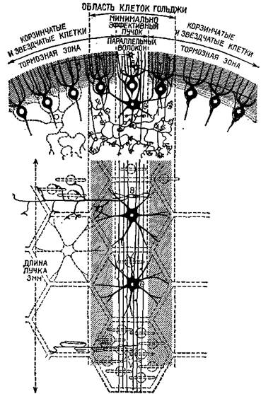 Рис. ХП-12. Схема, показывающая распространение тормозных полей (затемненные области) в случае возбуждения узкого пучка параллельных волокон. Верхняя часть рисунка — поперечный разрез листа червя мозжечка; нижняя часть — вид на поверхность листа червя сверху. Предполагается, что существует «минимально эффективный пучок» одновременно возбужденных параллельных волокон, который, по-видимому, способен стимулировать организованные в ряды клетки Пуркинье, звездчатые и корзинчатые клетки. Клетки Гольджи, имеющие самую развитую сеть дендри-тов, вероятно, наиболее приспособлены к возбуждению большими группами одновременно возбужденных параллельных волокон. Следовательно, эффективная стимуляция клеток Гольджи — как отрицательная обратная связь — может перекрыть всю «входную информацию», поступающую по мшистым волокнам. Таким образом, систему клеток Гольджи можно рассматривать как «фокусирующее» устройство, которое ограничивает — или усиливает — активность гранулярных нейронов (через систему параллельных волокон) в относительно узких группах (Eccles, Ito and Szentagothai, 1967).
