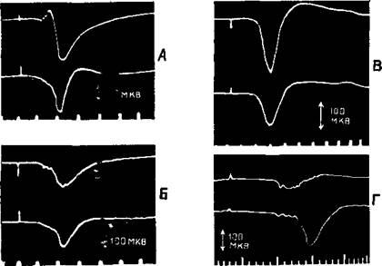 Рис. XIII-З. А — ответы в коре больших полушарий, вызванные стимуляцией седалищного нерва, перед удалением постцентральной коры и мозжечка. Верхняя кривая — ответь в постцентральной коре; нижняя — ответы в прецентральной коре. Время — 10 мсек. Б — ответы сразу после удаления обоих полушарий мозжечка; В — ответы после дополнительного удаления передней доли мозжечка; Г — ответы после дополнительного удаления обеих постцентральных извилин. Заметьте, что в постцентральной области теперь регистрируются только ответы белого вещества мозга
