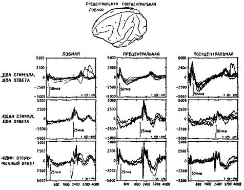 Этот анатомический парадокс особенно ярко проявился в ходе экспериментов, в которых изменения электрических потенциалов вызывались в коре посредством электрической стимуляции периферических нервов. Однажды совершенно случайно было замечено, что такого рода изменения потенциалов возникают в моторной коре. Эти явления слишком противоречили известным фактам, чтобы сразу поверить им. Однако в действительности оказалось, что они были получены и другими авторами, хотя ни один из них не решился их опубликовать и имелось лишь одно упоминание об этом как о возможном артефакте, да и то — в сноске. Между тем наши эксперименты (Malis, Pribram and Kru-ger, 1953, рис. XIII-3) и работы других авторов (Albe-Fessard, 1957; Penfield, Boldrey, 1937) показали, что входные импульсы от периферии действительно достигают моторной коры, что они проходят через дорсальный таламус, а не через уже давно изученные сенсорные зоны коры, такие, как соматосенсорная кора, примыкающая к моторной, и что эти импульсы не зависят от мозжечка. Кроме того, было показано, что входные импульсы возникают не только в тех нервных волокнах, которые иннерви-руют мышцы, но также и в тех, которые связаны исключительно с кожей.