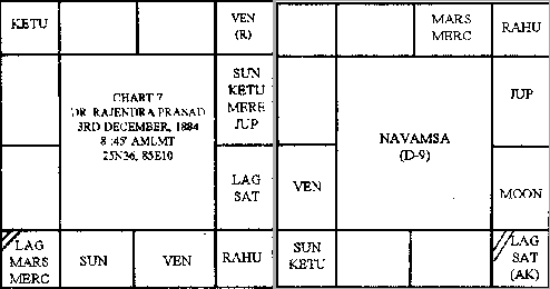 В Навамша, Лагна и КАРАКАМША - одна и та же Дева, таким образом указывающая стадию для самореализации. Lagnesh (Меркурий) находится в девятом доме (trine) - указание его начальной профессии как адвокат, так как Сатурн - Atmakarak в Лагна, строфа 1.2.20 дает указание успеха в выбранной сфере, а Меркурий (строфа 1.2.17 - адвокат) показывает начальную профессию. Аспект узлов (особенно Кету) занял его борьбой за свободу Индии, а аспект Солнца (из Стрелец) указал его заключительную профессию как политика и его господство в должности Президента Индии. Венера в пятом (красноречие и успех в дебатах). И в Rasi и Навамша имеется grahamalika yog от девятого дома на Лагну (Rajyoga).