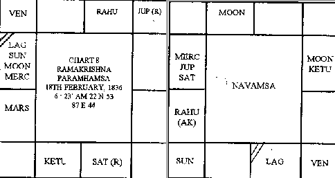 в проявленном мире. Bhratrukarak показывает Bhakti или бессмертную склонность сердца. В Навамша КАРАКАМША - Козерог с Солнцем в 12-м доме в Стрелец. Солнце представляет Господа Шиву, а Стрелец показывает Его форму как учителя. Титул Шри Рамакришна как diety и стремление души были Шри Dakshineswara (форма Господа Шивы как преподавателя) и Satyaloka, соответственно. Amatyakarak Марс находится в Раке, и шестой оттуда - снова Стрелец с Солнцем, указывая, что его хлеб насущный (и физический и духовный) будет дан Шри Dakshineswasa и его Karma йогой, которая ведет к бессмертной известности, все будет вызвано Солнцем - Стрелец. Действительно примечательно, что Swami Vivekananda был рожден в Стрелец-лагна с Солнцем. Фактически, Ramakrishna Paramhansa говорил, что в Swami Vivekananda он видел Господа Шиву. Является ли это простым совпадением, что Swami Vivekananda, его выдающийся ученик основал Ramakrishna Mission, что дало Paramhamsa и его учению бессмертную известность? Bharatrukarak - Луна, показывающая bhakti (любовь и привязанность) к Божественной матери в форме Шри Кали Ма.