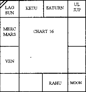 В карте 14, Лагна, hora Лагна и ghatika Лагна находятся в Тельце, с которым соединяются королевские планеты Солнце и Луна, и aspected Юпитером, что дает три мощных yogadas, включая экзальтированную Луну и указывая, что rajyogas был бы прежде всего - наследованием (аспект Юпитера).