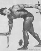 Выполнение: (1) Встаньте, слегка согнув колени и выставив одну ногу перед другой. Обопритесь свободной рукой на низкую скамью для равновесия. Возьмите гантель в другую руку, согните ее и отведите локоть назад, подняв его примерно до высоты плеча. (2) Удерживая локоть в неподвижном положении, отведите руку с гантелью назад, пока предплечье не будет почти параллельно полу. Задержитесь на секунду-другую и напрягите трицепс, затем медленно вернитесь в исходное положение. Для дополнительного развития трицепсов немного поверните запястье во время движения, чтобы большой палец, смотрел вверх. Закончив серию, повторите упражнение для другой руки. Следите за тем, чтобы в движении участвовало только предплечье, а не верхняя часть руки. Это упражнение можно выполнять и на блочном устройстве.