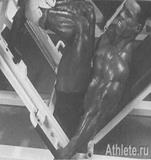 Выполнение: (1) Подойдите к стойке, заведите плечи под гриф штанги. Затем, удерживая локти в поднятом положении, скрестите руки перед собой, возьмитесь за гриф и снимите штангу со стойки. Отступите в сторону и слегка расставьте ноги для равновесия. Мне легче выполнять это упражнение, если я стою на низком блоке. (2) Согните ноги в коленях, удерживая голову поднятой, и приседайте с прямой спиной, пока ваши бедра не опустятся ниже линии, параллельной полу. Затем вернитесь в исходное положение.