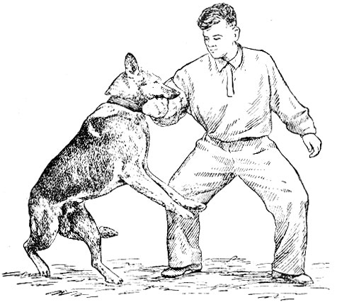 Помощник, убегая от собаки, оглядывается и следит за ее движением. Как только собака его догонит, он подставляет ей правый рукав дрессировочного костюма для хватки. Собака хватает помощника за правый рукав (а возможно в первый раз и за другое место дрессировочного костюма), помощник останавливается и инсценирует борьбу с собакой, ведя себя таким образом, чтобы всегда победителем в этой борьбе была собака. Борьба должна сопровождаться криками помощника (рис. 166).