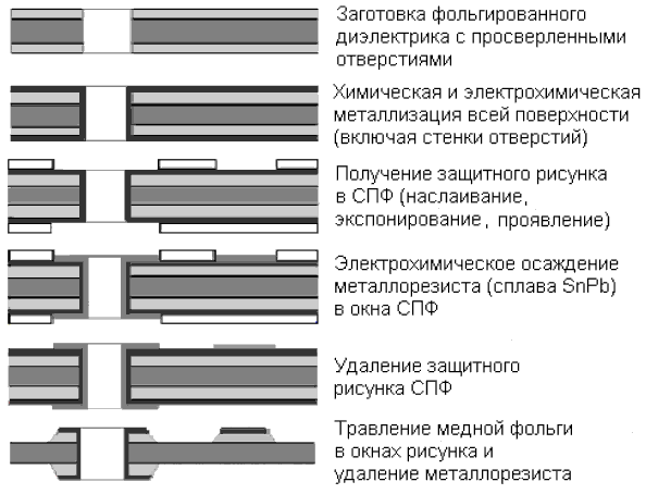 Второй вариант (рис. 14.1.3) – позитивный процесс. Создается проводящий рисунок двухсторонних слоев с межслойными металлизированными переходами (отверстиями). Сухой пленочный фоторезист (СПФ) наслаивается на заготовки фольгированного диэлектрика, прошедшие операции сверления отверстий и предварительной (5-7 мкм) металлизации медью стенок отверстий и всей поверхности фольги. В процессе фотолитографии СПФ защитный рельеф получают на местах поверхности металлизированной фольги, подлежащей последующему удалению травлением. На участки, не защищенные СПФ, последовательно осаждаются медь и металлорезист (сплав SnPb), в том числе и на поверхность стенок отверстий. После удаления маски СПФ незащищенные (более тонкие) слои меди вытравливаются. Процесс более сложный, однако, с его помощью удается получить металлизированные стенки отверстий.