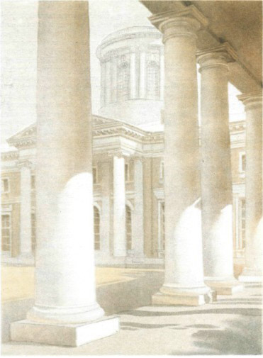 Нужно сказать о часто совершаемой ошибке в исполнении архитектурных акварелей. В поисках контура, многочисленных исправлениях, длительном рисовании или расчерчивании свежий лист бумаги превращают в грязную тряпку. Бумага темнеет и поверхность ее разрушается. При таком обращении с бумагой надеяться на успех в акварели не приходится.