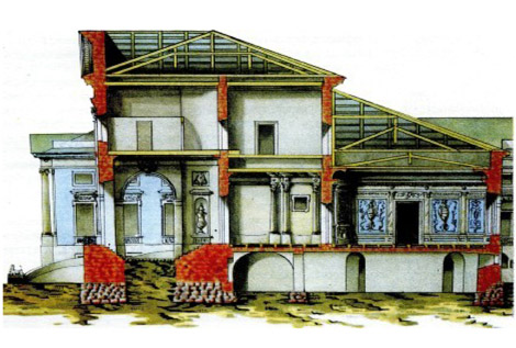 В чертежах старых мастеров бывают разрезы с полным показом конструкций разрезанных мест и с такой покраской сечения, которая соответствовала натуральным цветам строительных материалов; такие разрезы восполняли отсутствие конструктивных разрезов.
