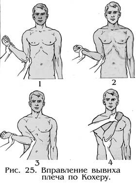 Способ Кохера (рис.25) весьма опасен из-за возможного чрезмерного насилия со стороны врача и должен применяться весьма осторожно. Этот метод не следует применять при переломовывихах, у лиц пожилого и старческого возраста и при значительном преобладании силы врача над силой пациента. Целесообразно применять этот способ для репозиции вывиха у молодых, физически крепко развитых мужчин. Вправление производится при постоянной тракции плеча книзу за согнутую в локтевом суставе руку под углом 90°. Он состоит из 4 моментов: