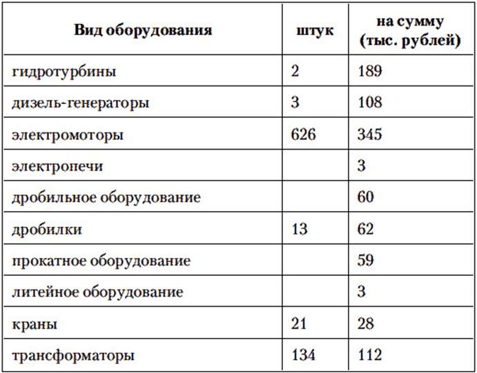 По этой таблице можно даже назвать основных производителей продукции, направленной за рубеж. Это – продукция заводов тяжелого машиностроения. Станки производились несколькими заводами: «Фрезером» и «Калибром», заводом револьверных станков в Горьком. Кузнечно-прессовое оборудование, молоты и пресса производились на Уралмаше и на Краммаше. Турбины производили ленинградские заводы «Красный путиловец» и Металлический завод. Электромоторы производил ленинградский завод «Электросила». Электропечи и трансформаторы выпускались на московском заводе «Электрозавод». Дробилки, прокатное и литейное оборудование – это все те же Уралмаш и Краммаш, а также Ижорский завод.