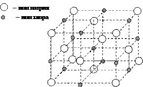 Ионную кристаллическую решетку имеют соли, оксиды металлов, основания, комплексные соединения. Структура кристаллической решетки зависит от размеров и природы катионов и анионов. Например, на рис. 22 представлена кубическая кристаллическая решетка хлорида натрия.