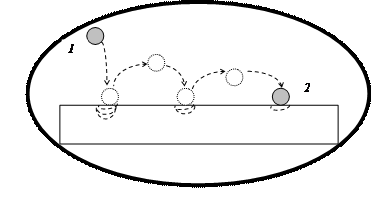Рис. 44. Модель рассеяния энергии (увеличения беспорядка) в результате падения шарика на поверхность пола. Цифрами обозначены: 1 - начальное, 2 - конечное состояние системы. Стрелки указывают направление самопроизвольного (необратимого) процесса. Система изолирована от окружающей среды