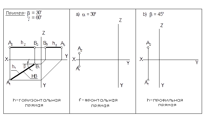3. Построить три проекции прямых параллельных а) – фронтальной, б) – профильной плоскости проекций, проходящих через точку А. Отложить отрезки АВ = 30 мм.