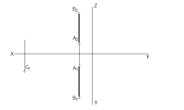 5. Через точку С провести фронтальную прямую, пересекающую отрезок АВ в точке, удаленной от П2 на 20 мм.
