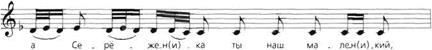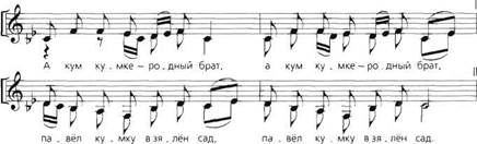 Развивающая функция пестушек и потешек обусловливает их сближение с другими жанрами музыкально-фольклорной традиции. Так, отмечаемое многими исследователями (Зи- лотина, Смирнова, с. 126) сходство ритмической организации потешек и взрослых плясовых песен вызвано задачей развития координации движений у детей. Обычно в основе пестушек лежат наиболее универсальные структуры плясового ритма: восьмивременники и примыкающие к ним цезурированные формы со стихом 7+7, а также сегментированные музыкальноритмические формы типа «Камаринской».