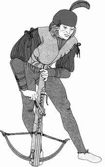 «кранкелином», зубчато-реечной передачей, позволяют дать три прицельных выстрела в минуту. Это если и арбалет силен, и стрелок силен (да, речь не о мастерстве, а о физической силе, позволяющей быстро вращать ручку натяжного