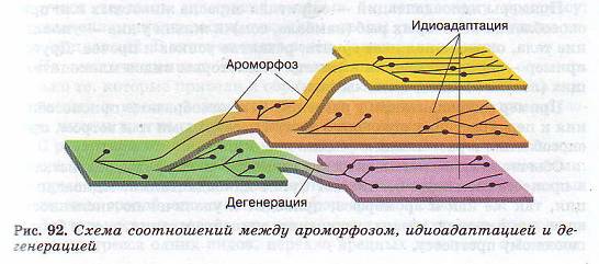 Для понимания исторического развития органического мира важно определить главные линии эволюции. В разработку проблемы эволюции значительный вклад внесли крупные российские ученые А. Н. Северцов и И. И. Шмалъгаузен. Они установили, что главные направления эволюции составляют ароморфозы, идиоадаптации и дегенерации (рис. 92).