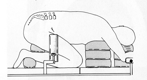 При операции на поясничном отделе позвоночника пациенту предают на операционном столе коленно-грудное положении (рис. 10) или на животе с использованием мягких подкладок под грудную клетку и в области гребней подвздошных костей. При таком положении предотвращается сдавление системы нижней полой вены, вследствие чего уменьшается венозное полнокровие и кровоточивость тканей в области оперативного вмешательства.